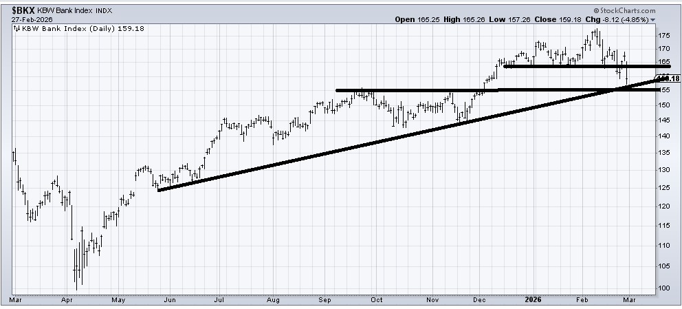 So what am I referring to when I say you cannot sleep through it? Well, just when you thought the panic in software was subsiding, along come the financials. Oh, sure, we’ve been talking about them for weeks (okay, months!), but last week the XLF, an ETF to be long financials (which means not just banks), broke 51, filled a gap just below it, and rallied back. That means there was a collective sigh of relief. Then on Friday, the selling picked up again. Notice that (at least for now) the XLF did not take out that low from last week.