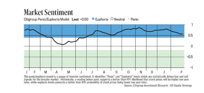 As for the overall market, for weeks now I have been saying if the S&P can break 6800 (6775 is the real level), I think we can get some panic. That is still the case because the various moving averages of the options ratios are stretched, the AAII folks have begun to lean bearishly with more bears than bulls and this week the Citi Panic/Euphoria Model, which seems to be forever stuck in the mud in Euphoria (that’s what I call complacency) has inched down to levels not seen since last May. So it is possible that a crack in those well-watched levels could bring us some panic. Heck, maybe the VIX would finally get jumpy.