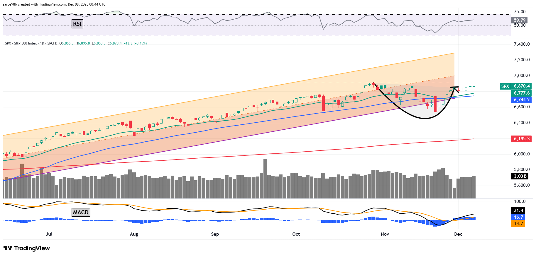 Bottom line? The cup pattern added a short lived and shallow handle last week. Of course this could change, but as the chart stood at week's end, the S&P 500 was still trying to break out of and hold a 6850 pivot.