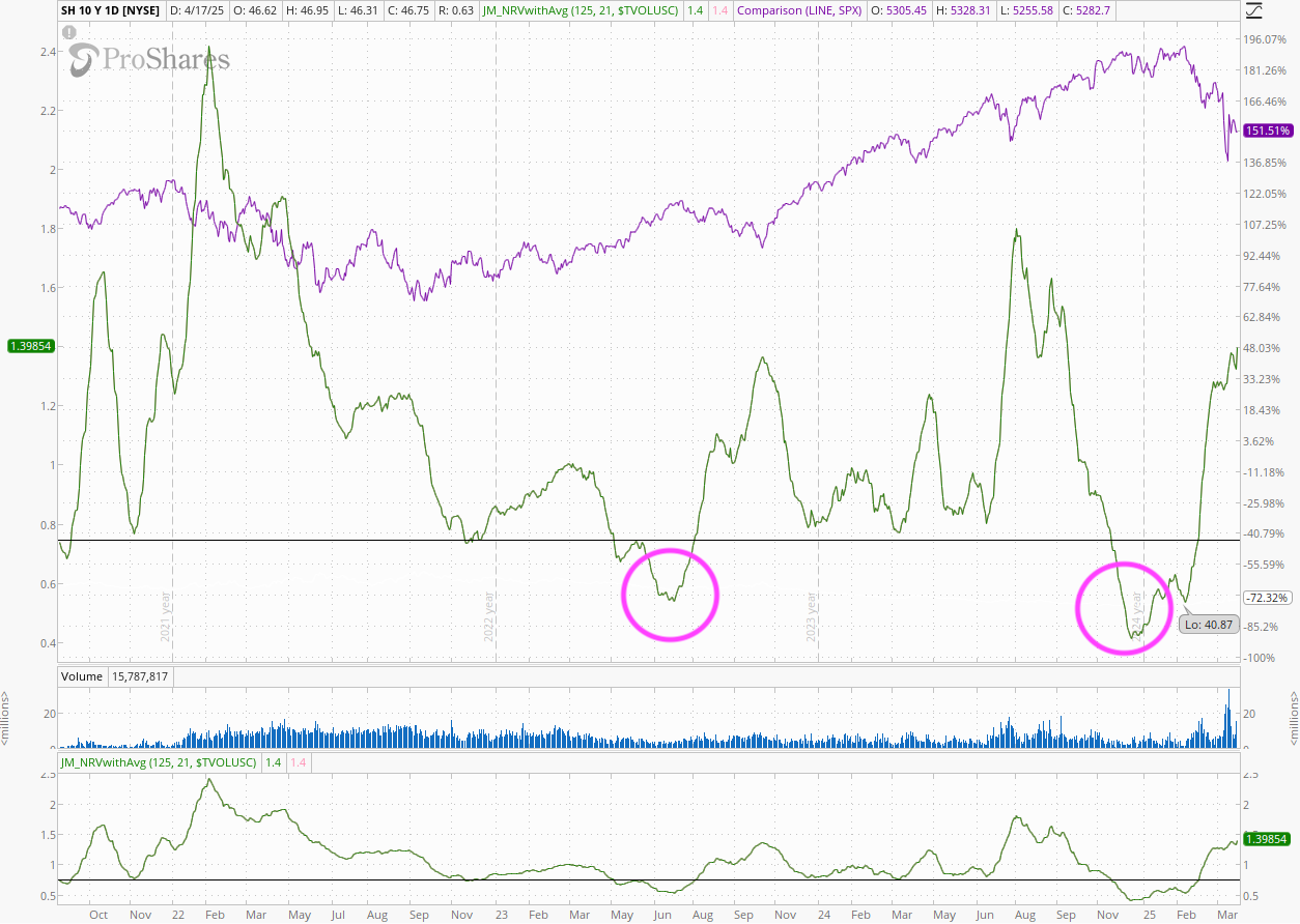 In the paper, I find that by normalizing a security's volume relative to the overall market, I can find times when that security might be ready to pop. I won't get into all of that here, but not included in the paper is work I've done on relative volume for inverse ETFs.