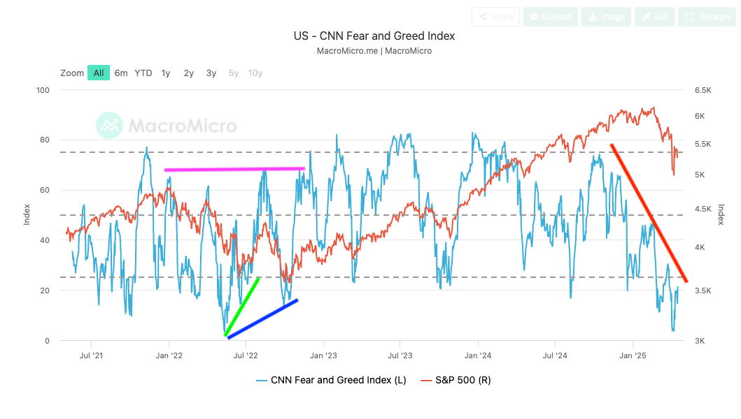 Similarly, when the market is trending downward, a bullish divergence (S&P 500 sets a lower low but the Fear & Greed Index sets a higher low) often signals a bottom. That’s what happened in 2022. See the green and blue trendlines in the chart.
