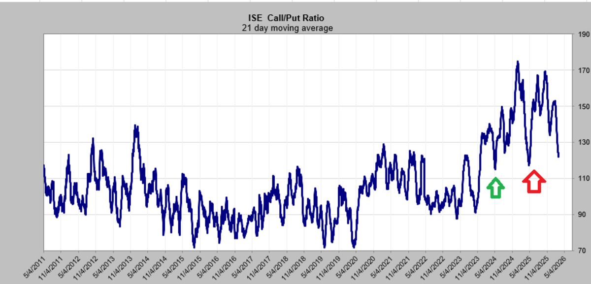 And if you told me that tech stocks would rally this week, I would have thought for sure the call buyers would be back in action. But that is not what has happened. I have spent a good deal of time in the last month discussing sentiment. I thought it was related to the collapse in the software stocks. I’m sure much of it was, but the 21-day moving average of the ISE call/put ratio continues to fall.