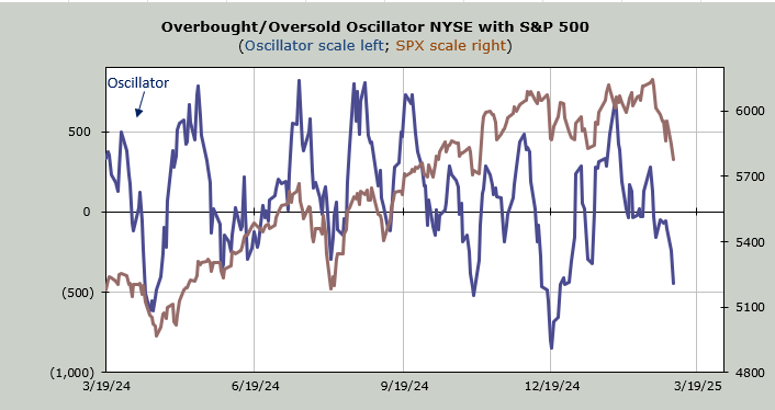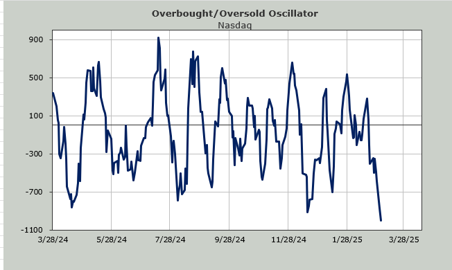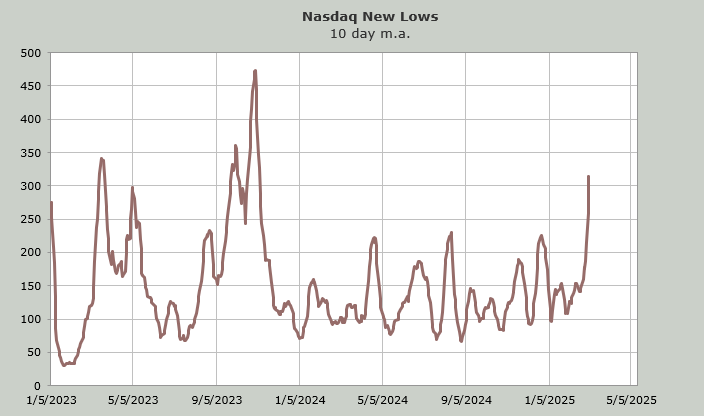 The number of stocks making new lows continues to expand. Nasdaq had almost 700 stocks make new lows. That’s a lot. That means there is no positive divergence (fewer new lows is a positive divergence), and you can see on a ten-day moving average it is now over 300. It was 450 at the October 2023 low. This is not bullish except that it, too, tells us how much selling we’ve seen.