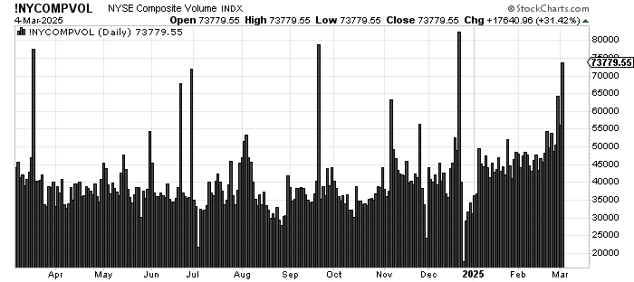 We saw the NYSE with 7.3 billion shares traded. We spend a lot of time talking about the Nasdaq volume but very little discussing the NYSE because it is so steady and constant. Just take a look at the volume through January and most of February: between 4.5-5 billion shares every day. But now notice the last two days: up and out of the range.