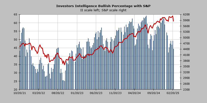 On the sentiment side of things, as I said, I do not see panic, but last week saw the Investors Intelligence bulls at 44%. I will be very surprised if they are not lower this week, although they probably took Friday’s rebound into consideration. But if this falls under 40%, I would not consider it extreme, but I would say at least we finally have another sentiment indicator that is lining up with the AAII reading.