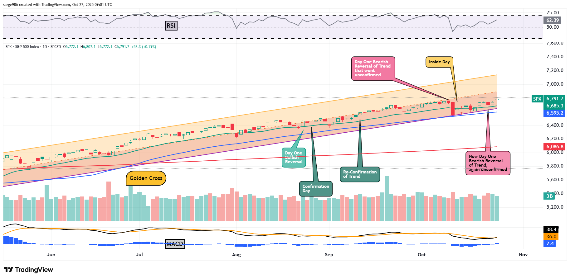 ​Last week, we discussed the "Inside Day" that occurred on Monday, Oct. 13 and how it had signaled a short-term decrease in volatility. Since that day, noted in yellow above, the S&P 500 has continued to work its way higher, despite two true (and three overall) failed attempts to confirm a "Day One" bearish reversal of trend. At this point, despite an honest attempt to shake investors out of this market in October, which was something we had predicted in this column, the S&P 500 remains on its bullish trek.