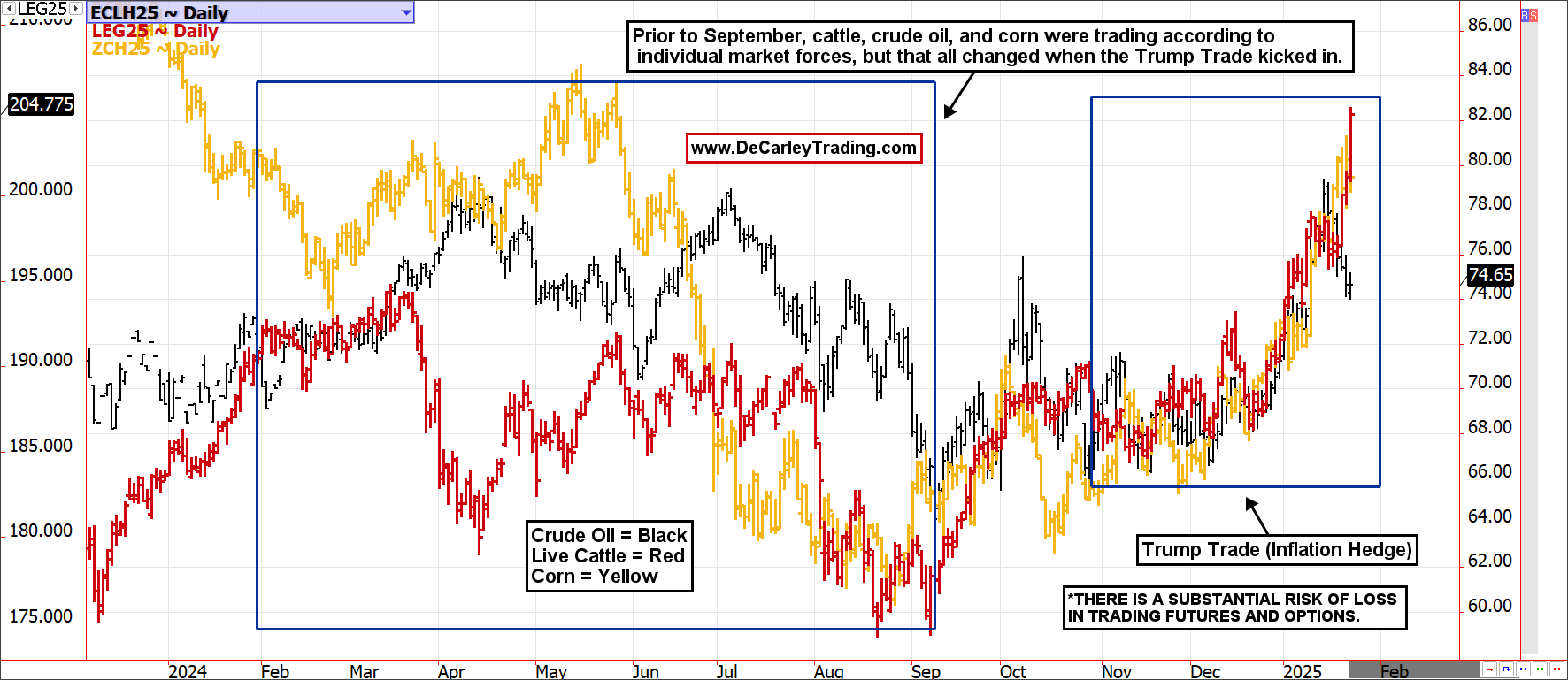 Almost as concerning is how the oil market trades with a strong positive correlation to the U.S. dollar; the dollar and oil are running in the same direction about 75% of the time, while the British pound and the euro are running a negative correlation of over 90%! The oil and currency markets haven’t been conforming to historical norms for quite some time (since 2022, to be exact), but I don’t recall correlations ever being this absolute. We have noticed that the oil market has broken down in recent sessions, but cattle and corn have not; we believe oil is likely the leader, leaving the others vulnerable in the coming weeks.