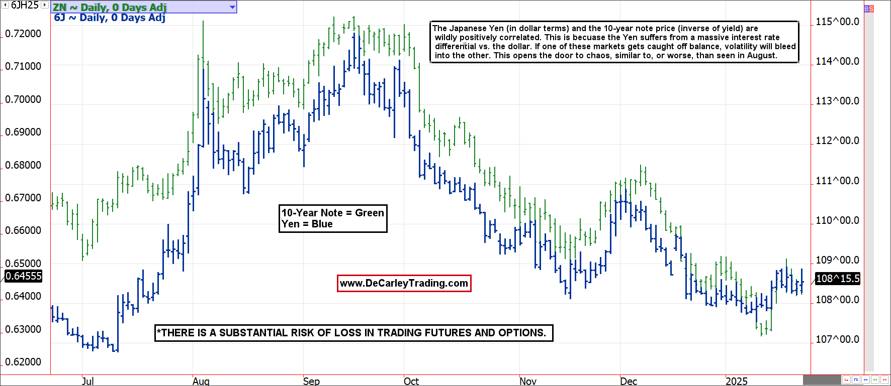On the financial side of the tape, we see the yen and the 10-year note settle in the same direction 93% of the time and opposite the U.S. dollar index about 91% of the time. Such aggressive correlations are rare and generally unsustainable. Further, I believe they are a sign that many of the trends we’ve grown to accept in recent months could be in the last innings of the game.