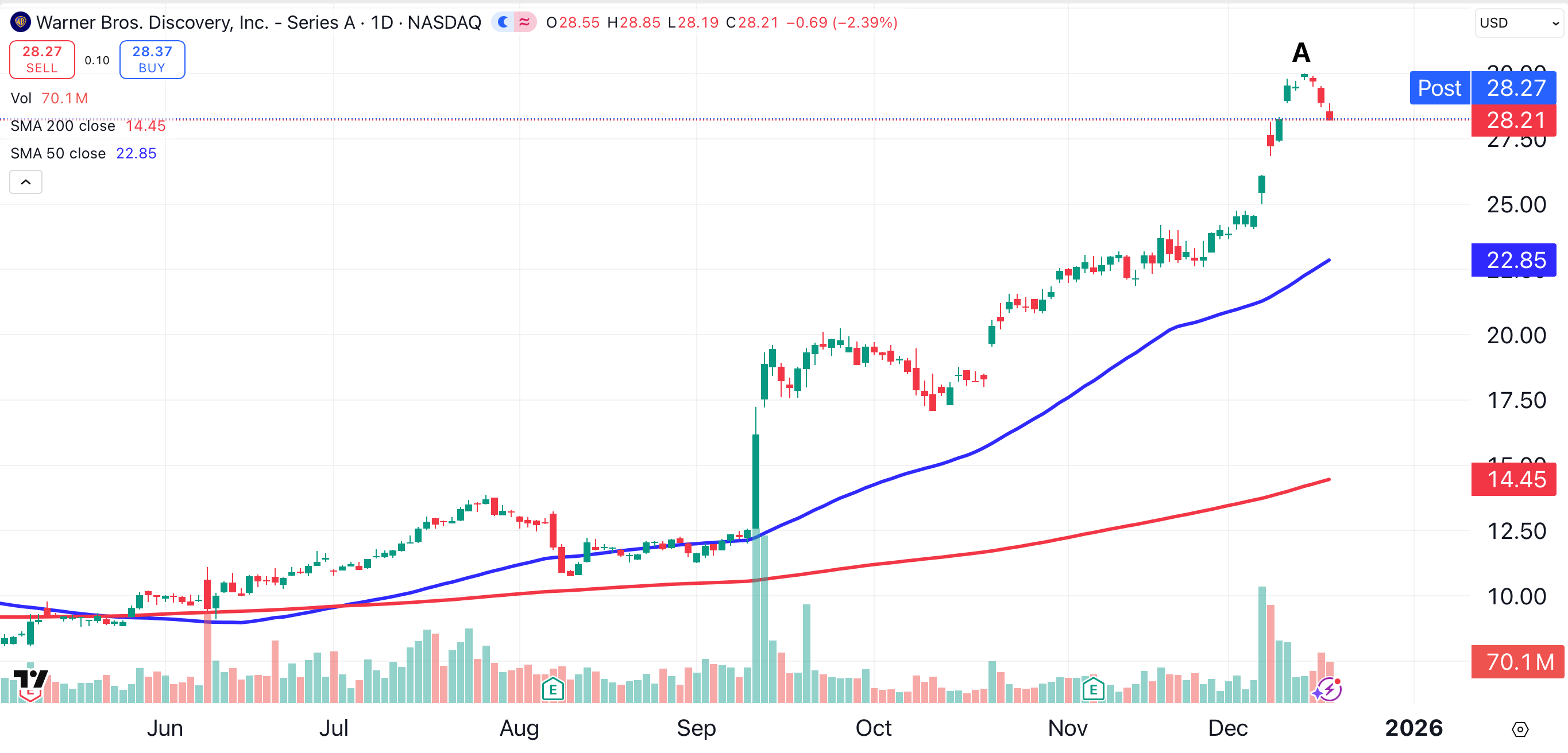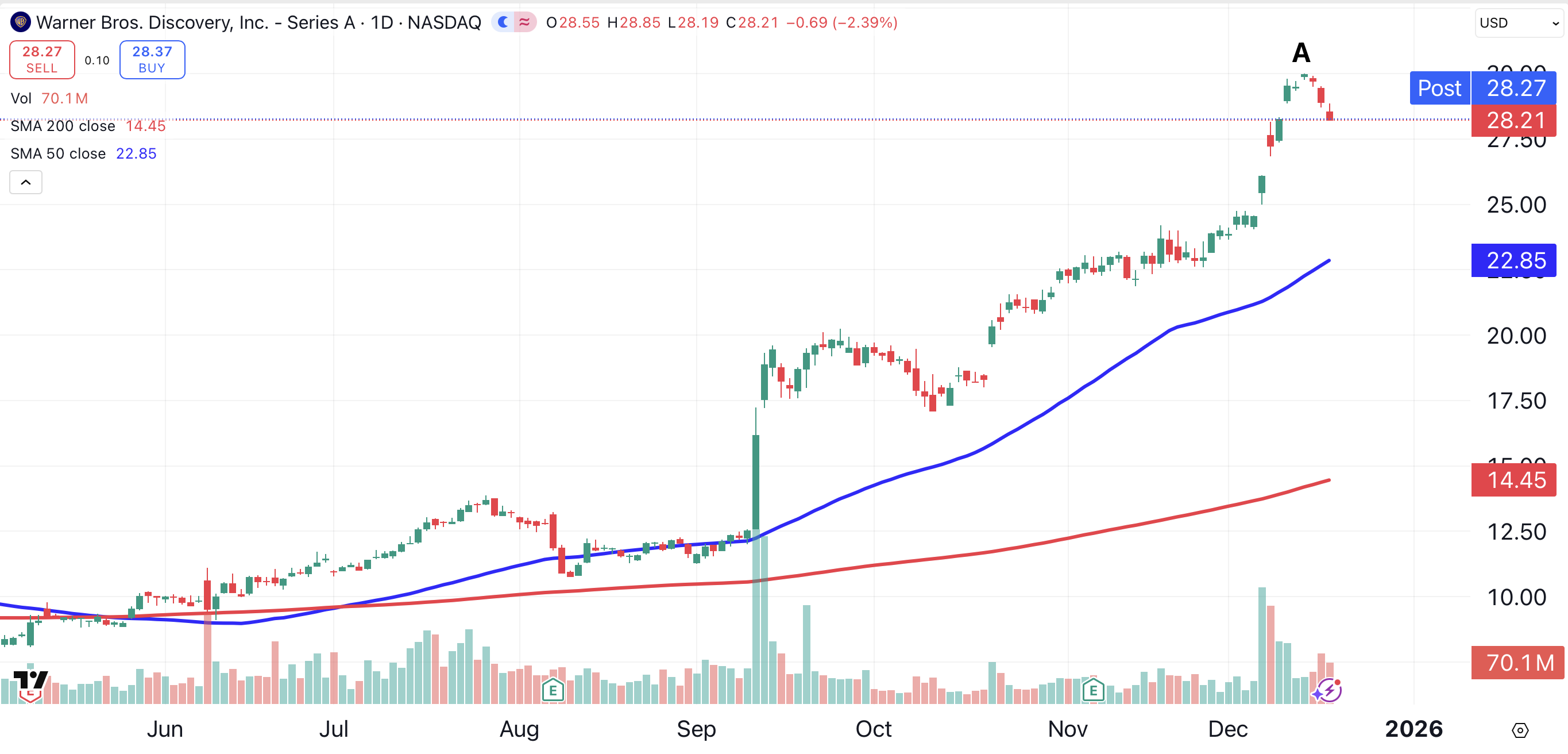 Warner Bros. shareholders are already suffering due to the board’s decision. Shares of Warner Brothers changed hands at $30 on December 12 (point A). Since then, those shares have declined for three consecutive days, losing about 6%, as that $30 offer has now been rejected.