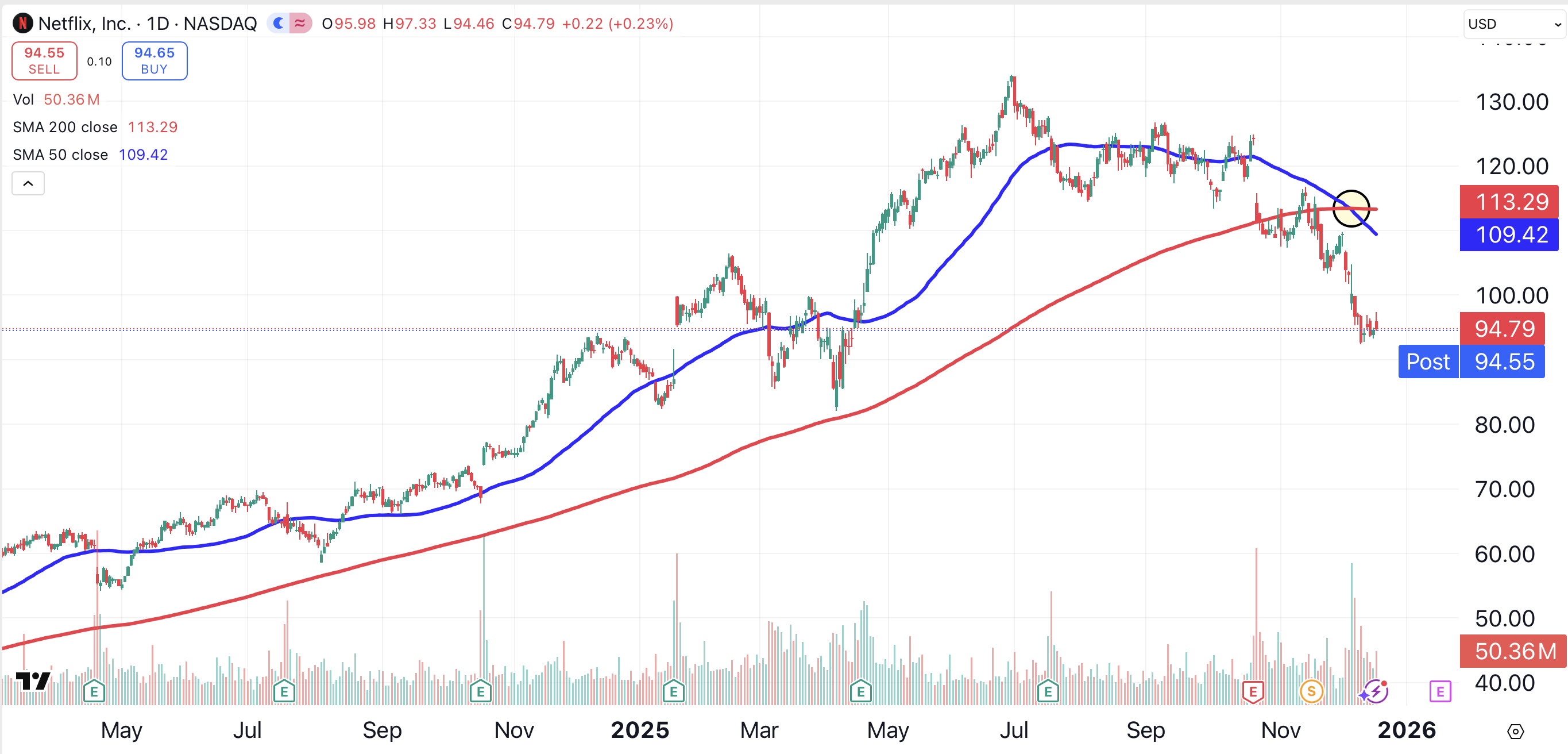 Netflix shares could continue to slide. The stock is trading below its 50-day (blue) and 200-day (red) moving averages, which recently formed a bearish crossover (shaded yellow).