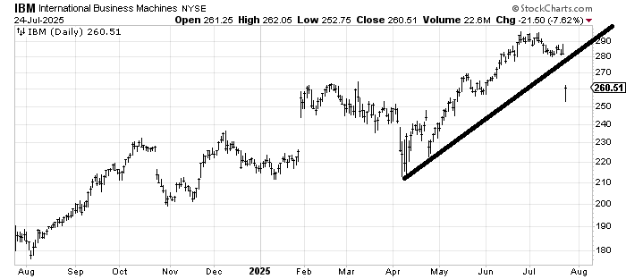 IBM IBM also didn’t build a big top but it, too, got clocked on earnings. It’s into support now but that’s a quick 10% whack, giving up all that it gained in the month of June.