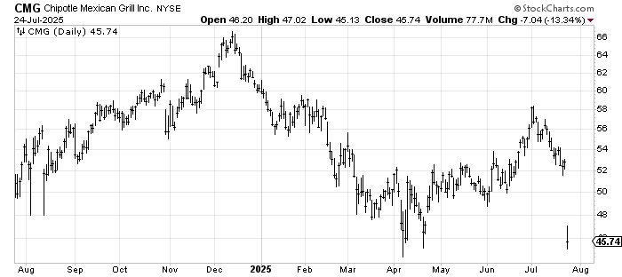 Chipotle CMG is no longer the hot stock it once was, but that’s down 20% from the time we turned the calendar to July and it’s right back at the April low.