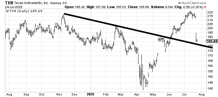 But then there is a stock like Texas Instruments TXN. They didn’t have great earnings but that little sideways move from a new all-time high gave no warning. The stock should find some support at that line, but that’s not great action.