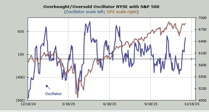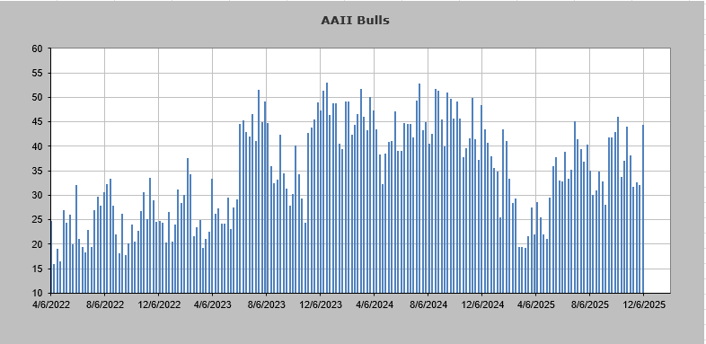 As long-time readers know, I prefer to use this survey when there is confirmation from other surveys because it tends to jump around so much. Unfortunately, the Investors’ Intelligence folks took last week off, so there was no report this week, but the folks at the National Association of Active Investment Management (NAAIM) did up their exposure to the market. They are now at 98.5. Their recent peak in late October was at 100.5, so while they never backed off too much, they have definitely increased their exposure.