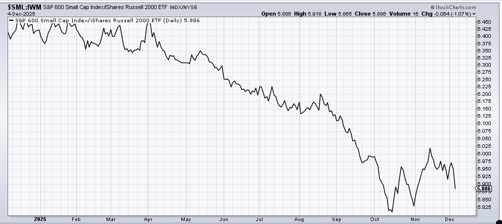 Thus, I would like to note to you it was actually a little bit red on Thursday. I would also like to show you the chart of the SML relative to IWM because, as you can see, early November brought us a reprieve from unprofitable small-caps leading the charge. However, since mid-November, we’re back to unprofitable leading, and Thursday saw it in a big way as the ratio plunged.