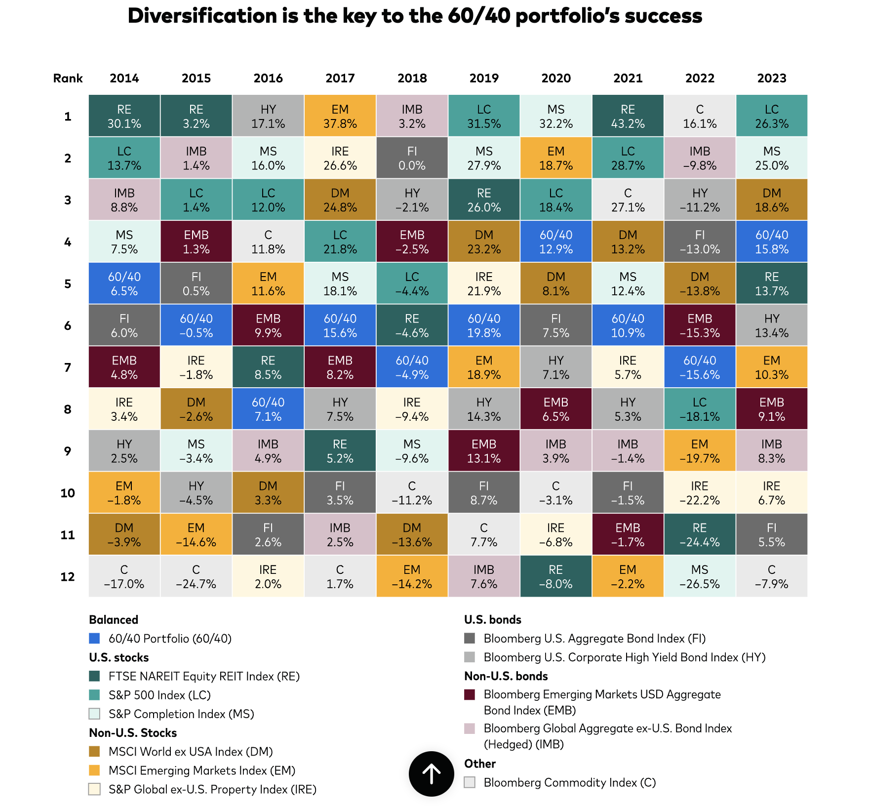 Here's an example from Vanguard of how a 60-40 portfolio has performed vs different asset classes. Notice how RE, real estate is sometimes the best performer and sometimes the worst? But 60/40 just chugs along. It doesn't make money every year, but it's relatively stable.