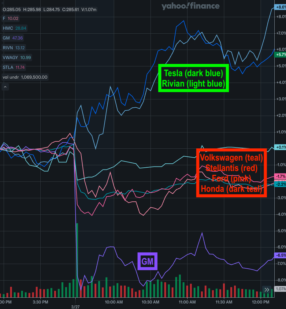The chart below is an intraday chart showing the decline at the opening of trading Thursday, through about midday. It shows clearly the assumed winners and losers of the upcoming tariffs. Tesla and Rivian will be shielded. Everybody else is in trouble.