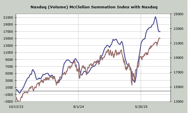 That leaves us with a market where the indicators haven’t changed much in weeks. The McClellan Summation Index, despite last week’s "493" rally is still heading down. Even the Nasdaq’s, where I use volume, is still heading down. And that is with the Nasdaq’s volume (up minus down) having been positive for the last 10 trading days.