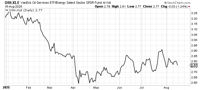 Although I am unsure if energy can catch fire for a few days. I like the ratio of VanEckk Oil Services ETF OIH to Energy Select Sector SPDR Fund XLE to see if OIH is outperforming to determine an energy rally. As you can see from the chart below it’s been in a very gradual uptrend since April but it’s lagged greatly in the last few weeks.