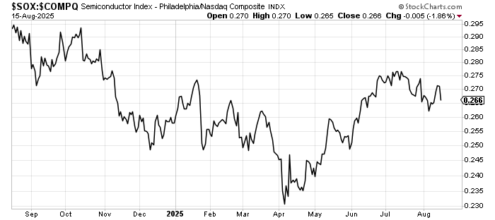 Speaking of ratios, the SOX continues to underwhelm the Nasdaq, having made a high for this rally (from April) in early July, and is still well below the highs from the summer of 2024.