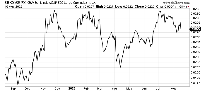 And the banks relative to the S&P 500 also peaked in early July, having not been able to get over that level they saw in November and again in February. So those two key groups have been rotated out of (on a relative basis) for six weeks now.