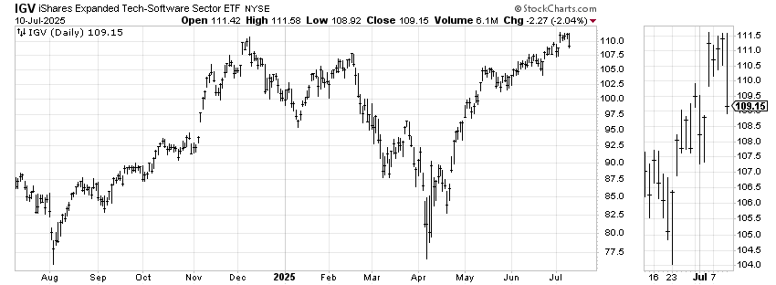 But let’s take a look at IGV, an ETF to be long software stocks. The ETF got hit for two percent on Thursday, essentially having stopped right at last December’s high. Take a look at the zoomed-in portion on the far right of the chart. There is a gap that is being filled right now from last Thursday’s gap-up on the Employment report.