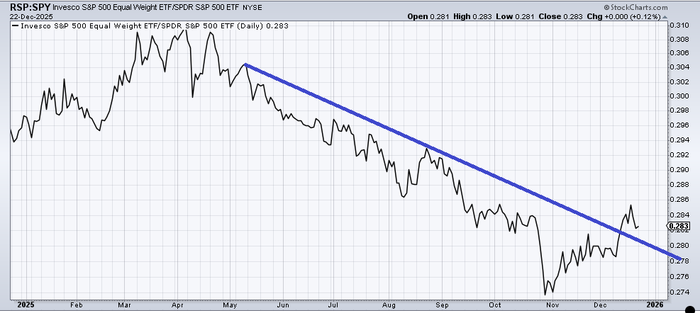 Speaking of ratios, the equal weight (RSP) has also not taken the lead since we started rallying late last week. Look how great it did on a relative basis in early December. It might still work out, but as I have noted, it does not look to me as if this will be a runaway train.