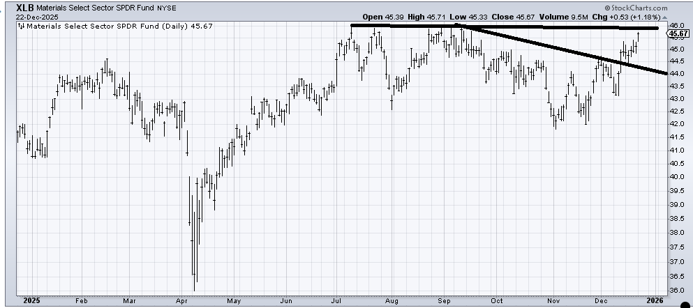 Away from all of that, my old friend XLB has caught some fire—a very small one, maybe with only twigs, no yule logs here! —and now finds itself up against some serious resistance at 46. This is one group no one even talks about, and has basically been a big fat nothing all year. I would love to see a breakout.