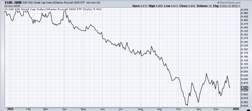 We will have to see if the ratio makes a lower low, but as you can see, the December high is lower than the November one. When the ratio is heading down, the Small Cap 600 index is underperforming the Russell 2000.