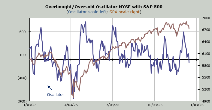 While I was looking for volatility this week (we’re getting it), I am still looking for an oversold rally next week. But this is all short-term stuff. As long as the intermediate-term indicators are not oversold, we’re just sloshing around. And I would remind you that tech has been showing weakness under the hood for months, and I don’t expect that to change just because the calendar turns to 2026.
