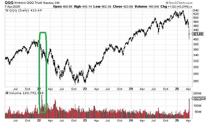 Notice that the market rallied off that massive volume. The QQQs rallied nearly ten percent. And yes, they did come down again. But that’s what I’m talking about: getting a rally off this sort of volume. And coming back down. That pattern is typical.