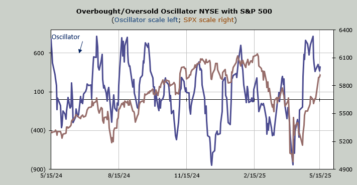 The Overbought/Oversold Oscillator hasn’t budged all week. So that’s a minor short-term negative divergence with the S&P 500 notching a higher high and the Oscillator at a lower high.