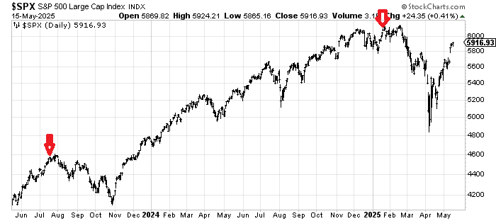 The other change is that the equity put/call ratio on Wednesday fell to 0.41. This is the lowest reading since mid-January. Prior to that we have to go back to mid-July 2023. Here is a chart of the S&P showing those two time frames.