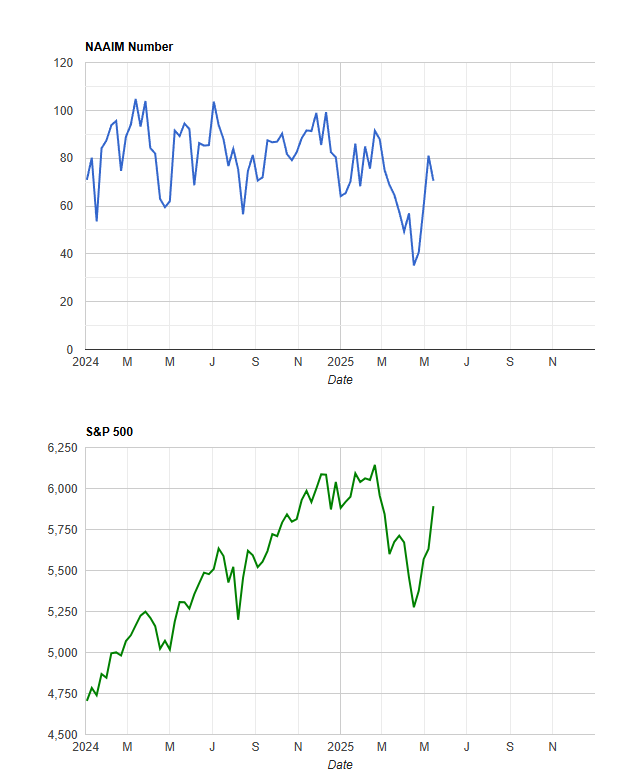 Sticking with sentiment, the NAAIM folks actually decreased their exposure to the market, which shocked me. They pushed down from 81 to 70. So no increase in bullishness there.