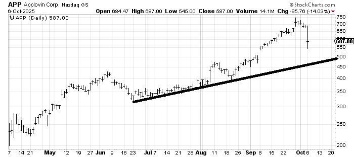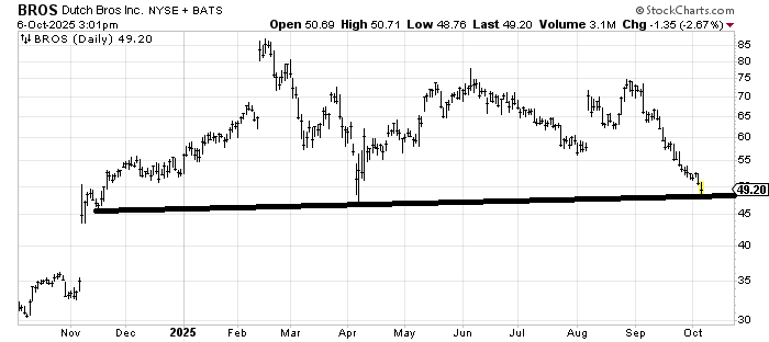Dutch Bros (BROS) is not a major stock, and it certainly isn’t an AI stock or even a metal or rare earth name. But do you see that gap up in early August? It was on earnings. I recall seeing the report and wondering why the stock had gapped up so much. Clearly, there were shorts running for cover.