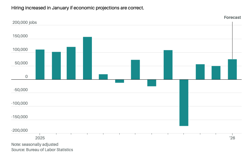 1. The January jobs report could finally confirm that the labor market has stabilized. The stakes are high, particularly as the Federal Reserve has signaled that interest rates could stay in place if employment conditions remain stable. A weak report could reignite the rate-cut debate among policymakers and markets, and ramp up White House pressure on the central bank. (Barron's)