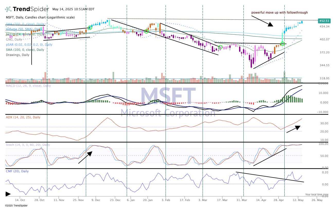 But as we know things change and with it the direction of the market can also move swiftly. Microsoft appeared destined to tag multi-month lows but a strong surge up and the establishment of an uptrend negated that thesis. Further, the indicators have improved greatly and now show a robust rally is underway as the stock reaches all-time highs.