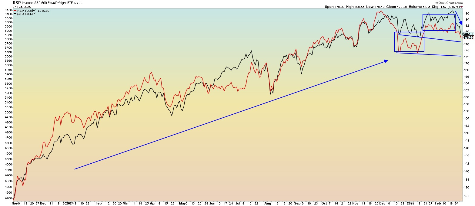 It is the end of the month and time for a look at the S&P 500 weighted index, or SPY, versus the equal-weight index, the RSP. We have noted divergences before when these ETFs were far apart, but now they seem to be gathering steam to the downside and are nearly at the same point on the comparison chart. What’s next?