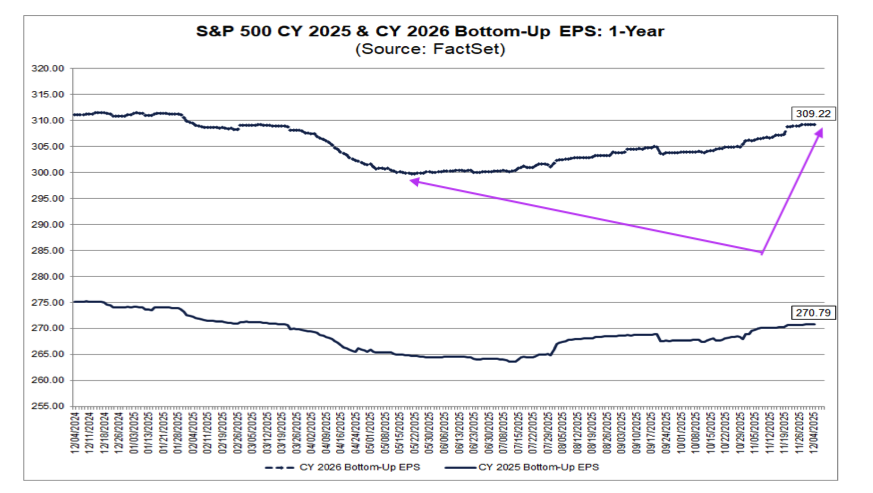 Typically, the economy, the strength of a company’s particular end market, company-specific positioning, pricing power, and input costs are key factors that influence revenue and EPS expectations. However, next year, corporations will be able to claim 100% bonus depreciation on qualifying property due to the passage of the "One Big Beautiful Bill Act" this year, which made the deduction permanent. The thinking is that while this would reduce net profit and table income, it should be a positive for cash flow that would help fund investment spending. It could also be used to foster larger stock buyback programs.