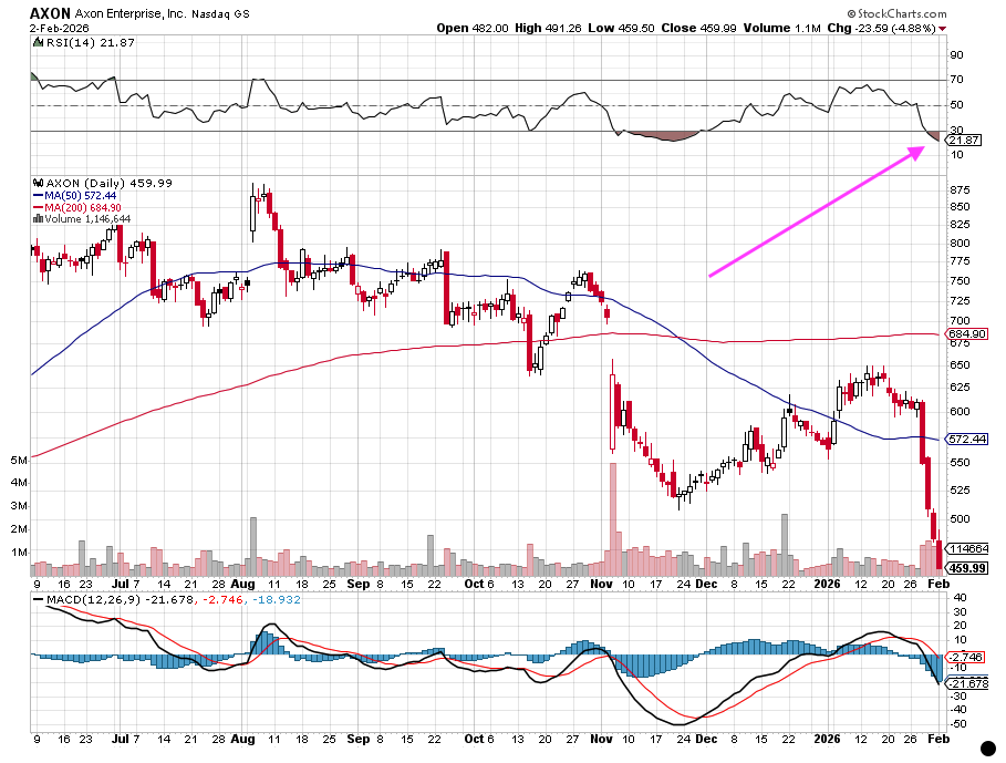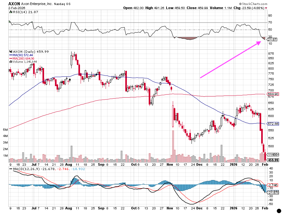 We are using a confluence of factors over the last few days to pick up more shares for the Portfolio. These include the pronounced pressure on AXON shares that has led to a plummet of more than 23% over the last several trading days, a move that, as we can see in the chart below, landed them in a deeply overbought condition.
