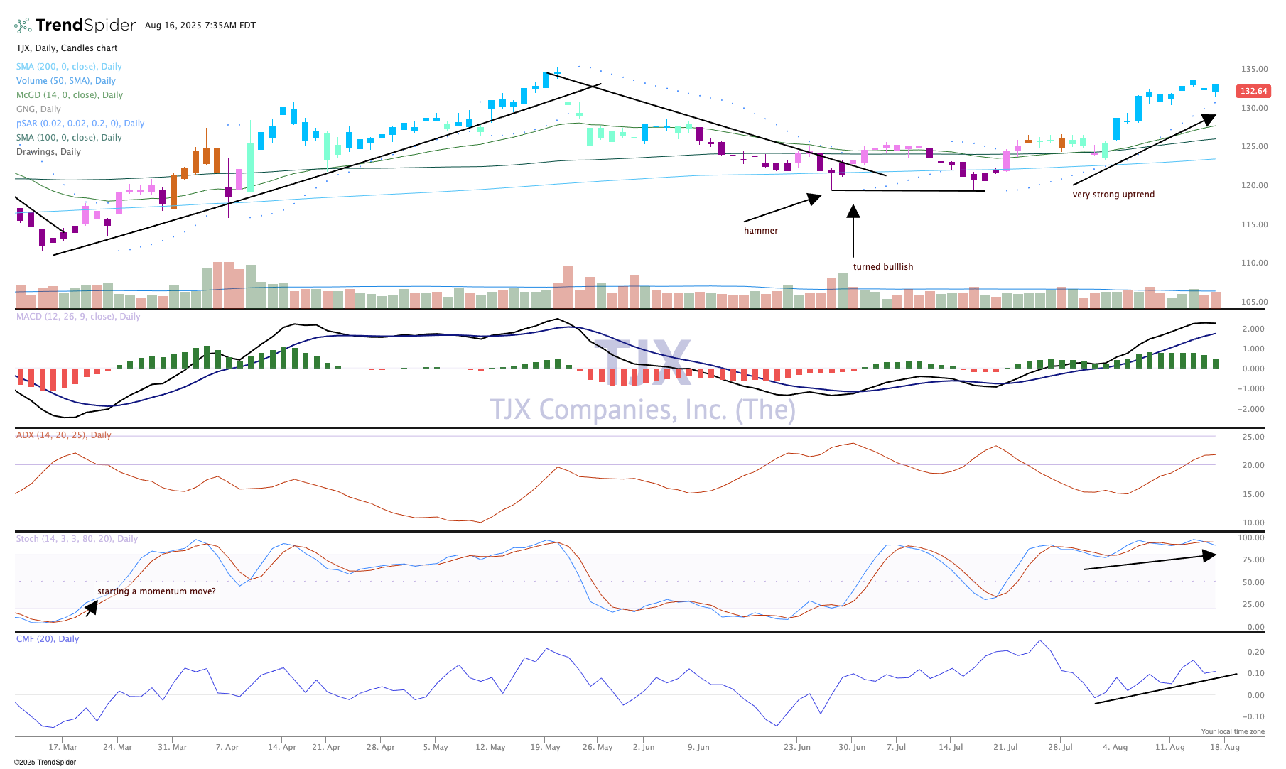 TJX Companies TJX may be one of those companies you just buy and leave alone for years. It has been a consistently strong stock for years. Looking at the weekly chart (not shown), we are treated to seeing a very strong and upward-sloping uptrend line. Even the dips down over the years were great buying chances. We recently saw one of those on the daily chart (shown), and that has launched the stock.