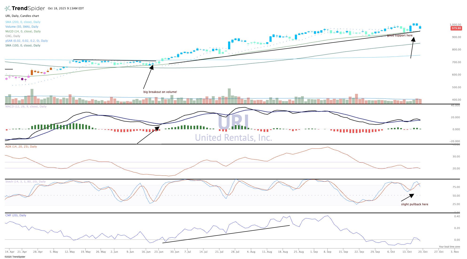 When you see a chart like United Rentals (URI) you tend to worry about whether the stock has built in positive results. URI will deliver earnings this Thursday and the company will likely post strong numbers and possibly better guidance. But the recent run higher from the last earnings report in July, from about $800 to the current price, is a whopping 25%. That move is impressive; the stock has delivered far better returns than the rest of the market, but unless the earnings are stellar we could see a modest pullback.