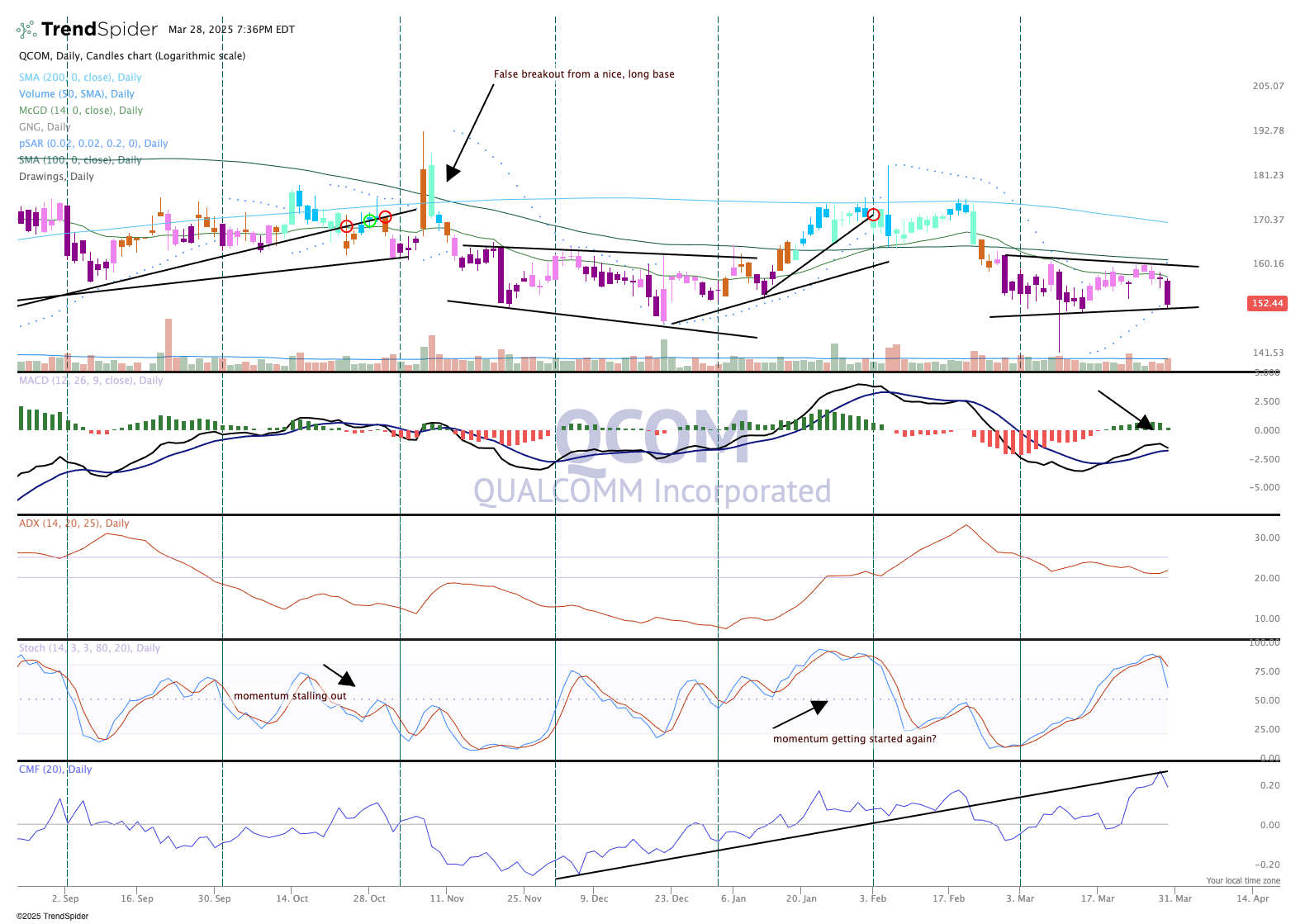 Qualcomm QCOM has frustrated us and many of its other shareholders lately with the back 'n' forth action that has trapped the stock within a range. For the better part of a month, QCOM has been trapped between $150-160, the range is well-defined here as momentum has been nascent or dropping for weeks. Can this stock regain some upward momentum?