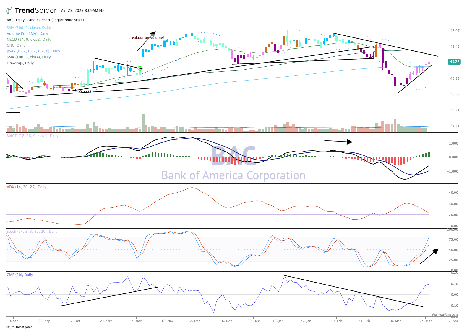 Further, there is sharp resistance ahead with the 200-day moving average and the downtrend line. With a good response to next month's earnings (which is very possible) BAC is going to make a run to $50.