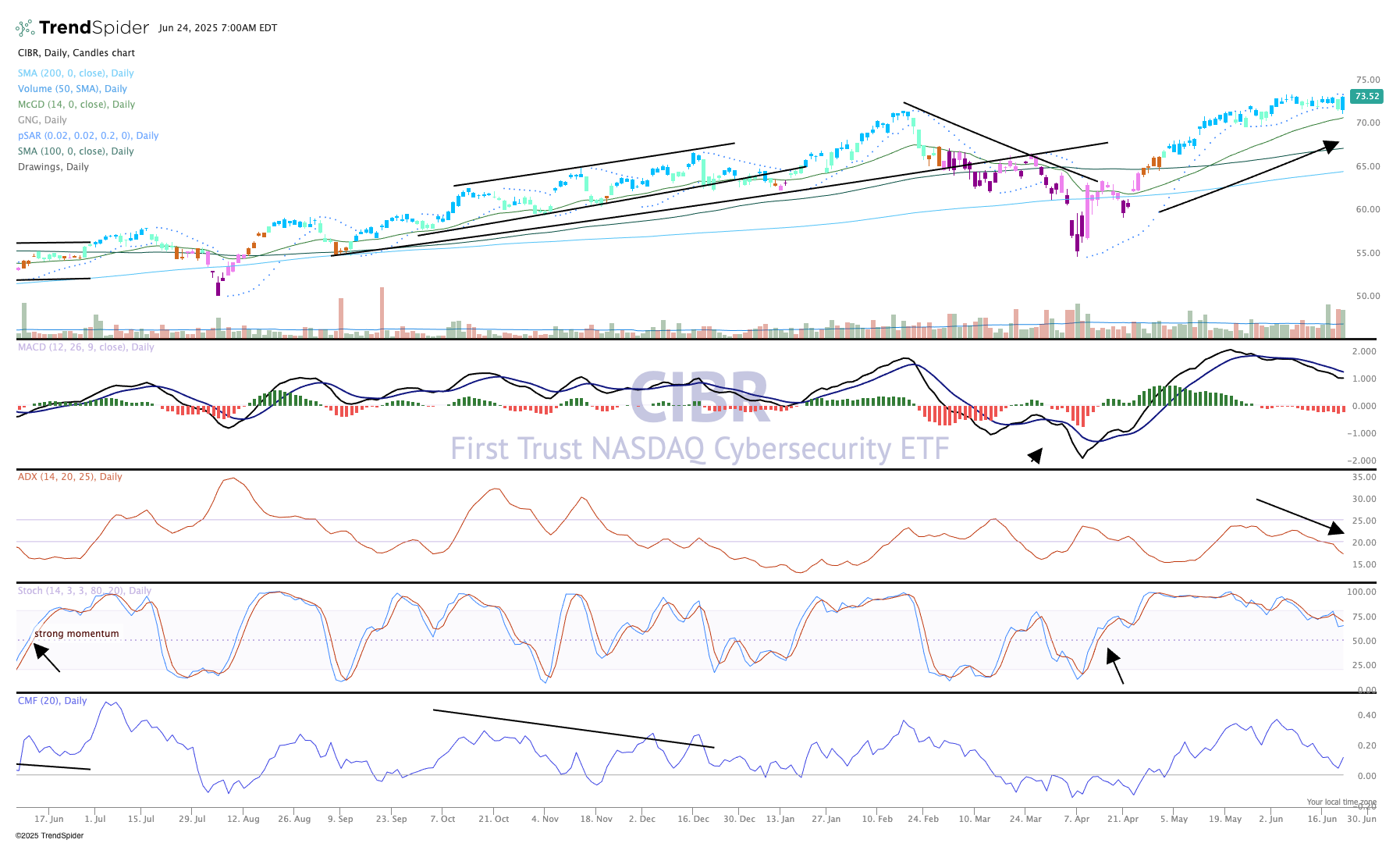 The CIBR chart is strong but is moving sideways, hence the indicators have slowed down considerably. While one might see bearish on the indicators that is certainly not the case with price action, which is still very bullish. At best, the bulls are taking a rest here on CIBR and waiting for the next catalyst, which might be earnings.