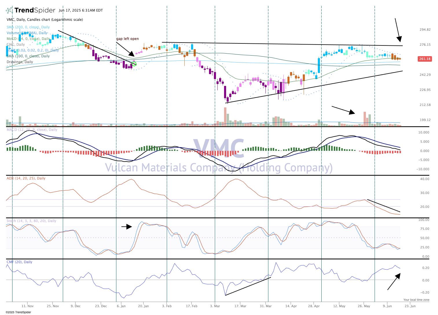 As we approach the next earnings season we like where Vulcan Materials is positioned on the chart, but with resistance at $276 (shown) the stock will need a strong catalyst to jump towards all-time highs.