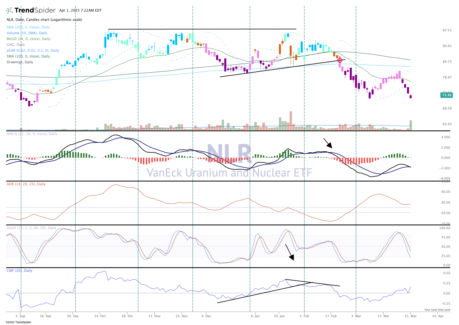 The chart shows the NLR in a downtrend, with lower-highs and lower-lows. The indicators look weak and momentum is coming out of the ETF here (stochastics, as seen in the second to bottom pane, headed lower), but money flow, in the bottom pain, remains bullish.