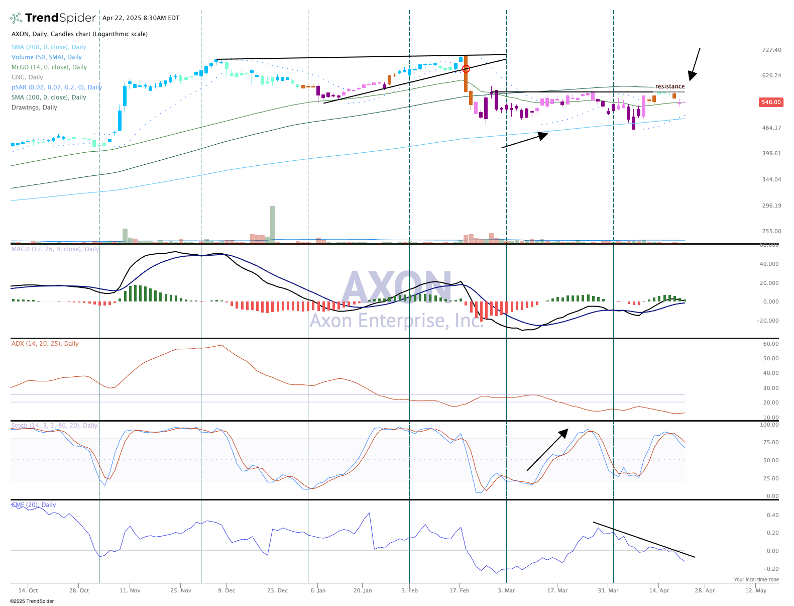 We look for that area to be tested soon and likely before Axon reports earnings in May. The old highs around $714 will be a challenge but given the strong beats from this company recently it would not be a surprise to us. This current area seems to be a safe spot to add shares.