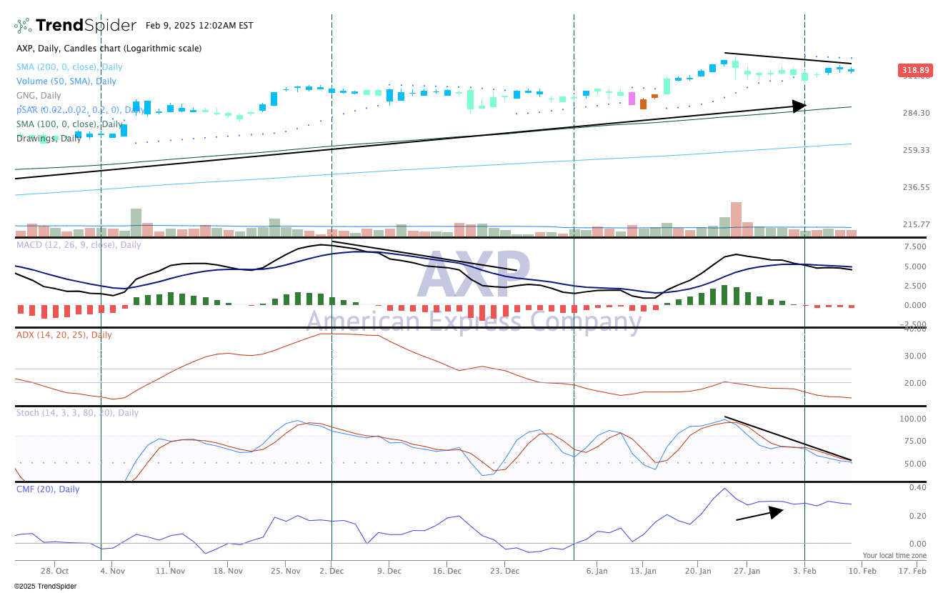 Following some strong earnings around the travel space we have seen American Express AXP continue to move higher. However, we notice the stock is currently trending sideways, perfect for a stock that recently reached an overbought state. Stocks need to take a rest from time to time after pushing to new highs like American Express did in late January.