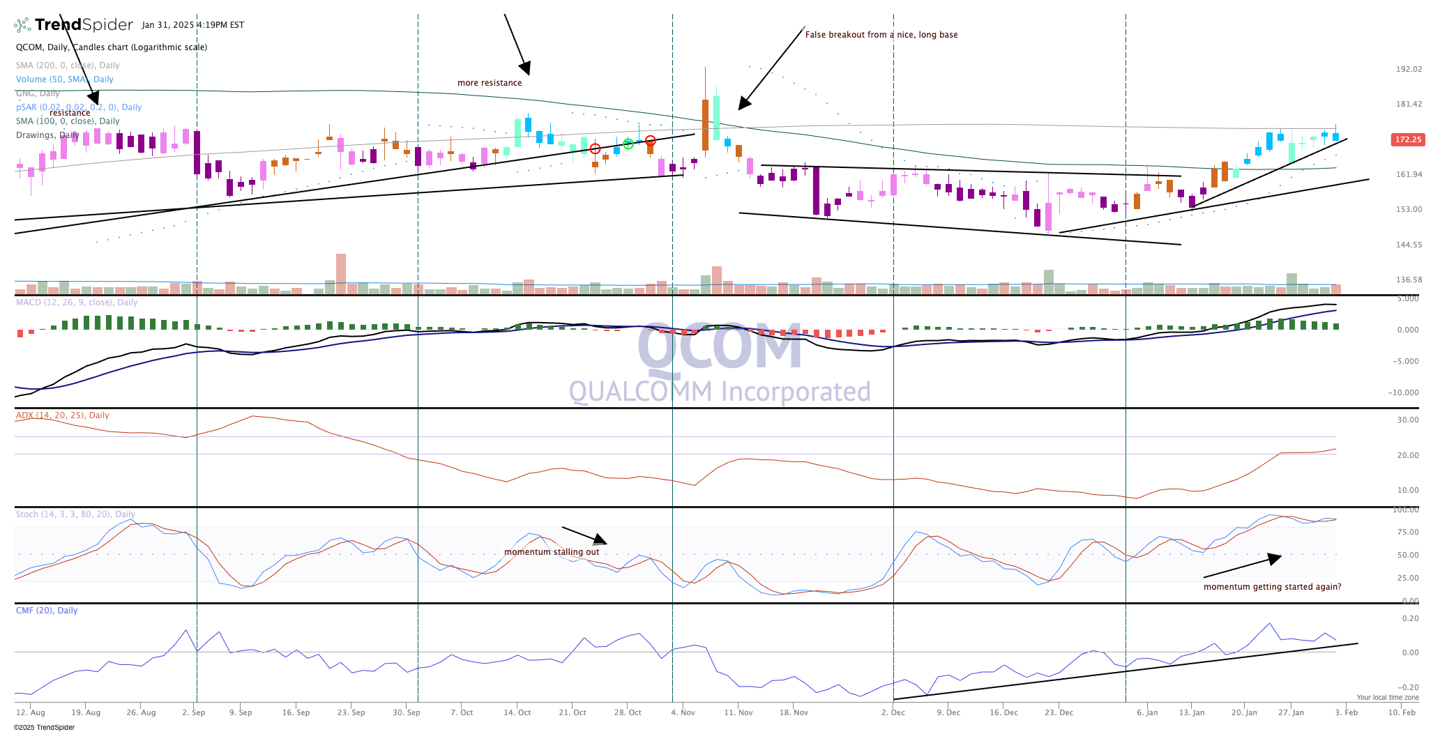 Qualcomm QCOM, which has been swimming in a pool of red for some time now, most recently broke above some heady resistance in the low $160s. That launched the stock into a new zone of resistance, but now as we see in the top pane of the chart below, the candles are blue/teal rather than purple/pink. That makes a difference, the trend is now bullish and there is good support if news is not taken well. Prior to this recent move up Qualcomm was making lower lows but not higher highs, and still had a downtrend in place.
